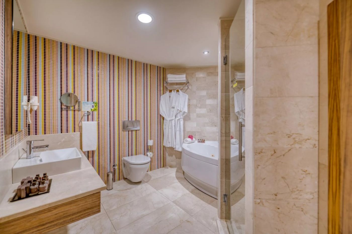В стаите: Състои се от една основна 9 етажна сграда, оборудвана с 6 асансьора и общо 303 стаи:Suit room, Terrace room, Gardenview room, Lateral seaview room, Seaview room, Family room. В стаята има централен климатик, телевизор, телефон, баня с душ, сешоар, мини бар (вода, безалкохолни напитки и бира - зареждат се 3 пъти седмично, безплатно), сейф (безплатно), балкон, сет за кафе и чай, под - ламинат.