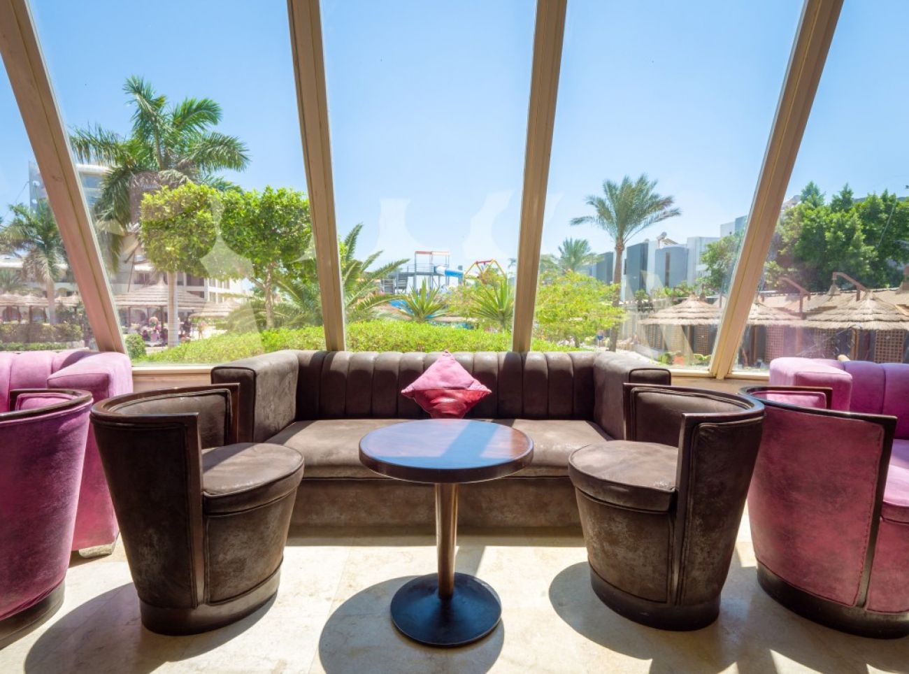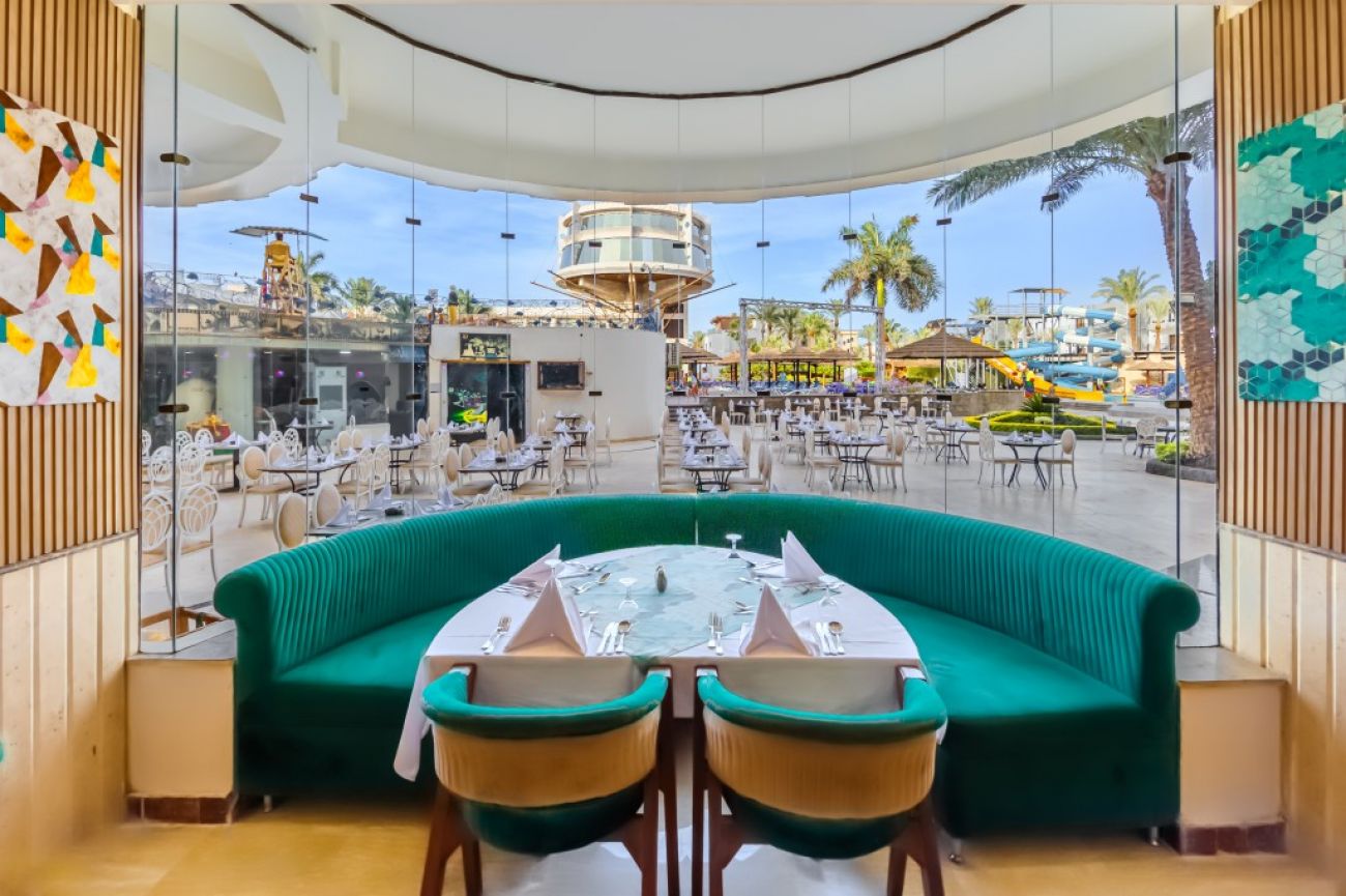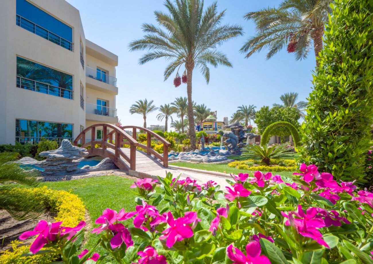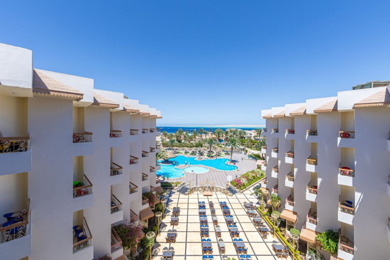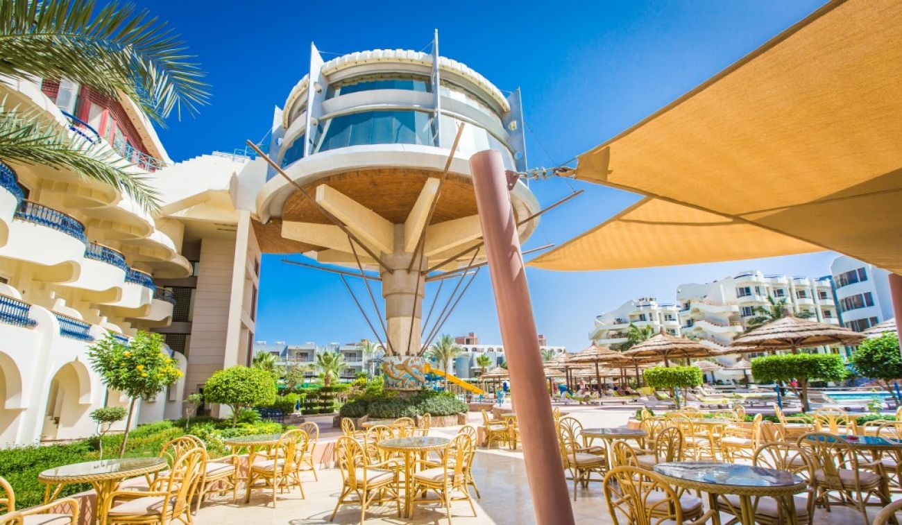 Разположение: Хотелът се намира в центъра на града. Наблизо има много ресторанти, барове и магазини. Има собствени водни пързалки. Препоръчваме го за младежки и семейни почивки с деца. Разположен e в самия център на Хургада и 10 км. от летището, на брега на морето. Състои се от комплекс от 3-, 4- и 5-етажни сгради. Обща площ: 71 875 м2.