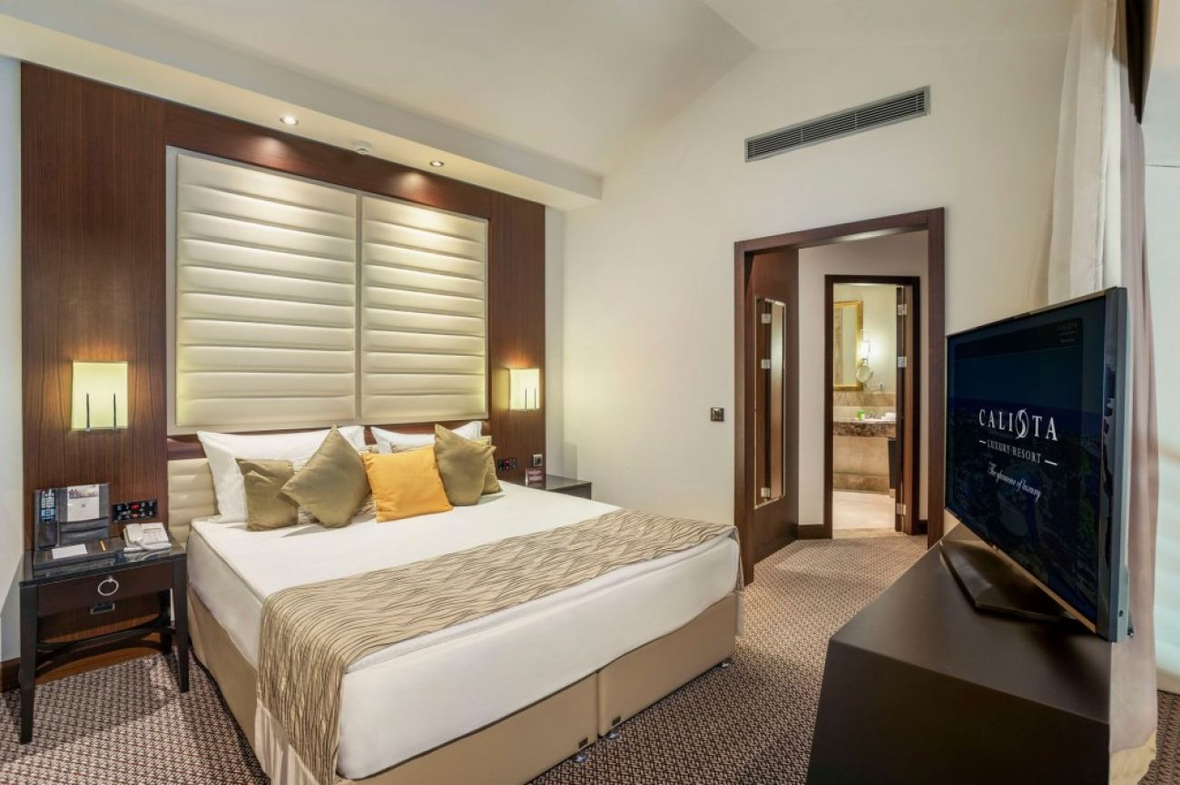 В стаите: Състои се от седем 4-и 5-етажни корпуса и четиринадесет 2-етажни вили и разполага с общо 600 стаи с изглед към градината. Стаите са оборудвани с централна климатизация, мини-бар (безалкохолни напитки, бира, ядки, вафли, чипс - ежедневно зареждане, безплатно), интерактивна телевизия, LCD32 телевизор, сейф (безплатно), телефон с директно избиране, Wi-Fi (безплатно), баня душ и вана, сешоар, дъска за гладене и ютия, халати за баня и чехли, балкон, сет за кафе и чай, ябълки и вино (в деня на пристигане). Почистване на стаите - ежедневно, смяна на спално бельо - ежедневно.