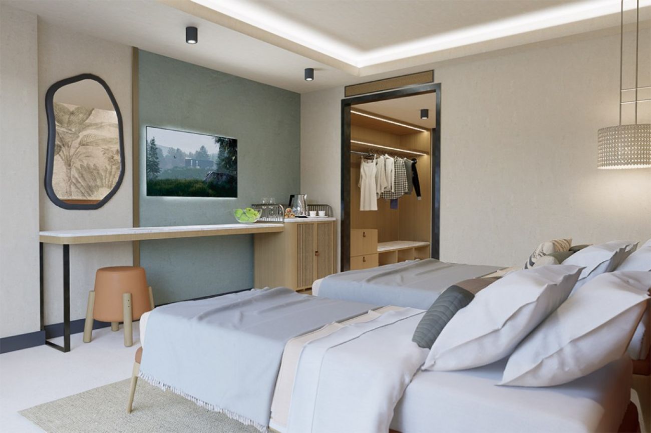 Family Room – 35 m2, 2 спални (1 двойно + 3 единични легла) Балкон, баня (душ-тоалетна), изглед: към градина/земя или басейна.