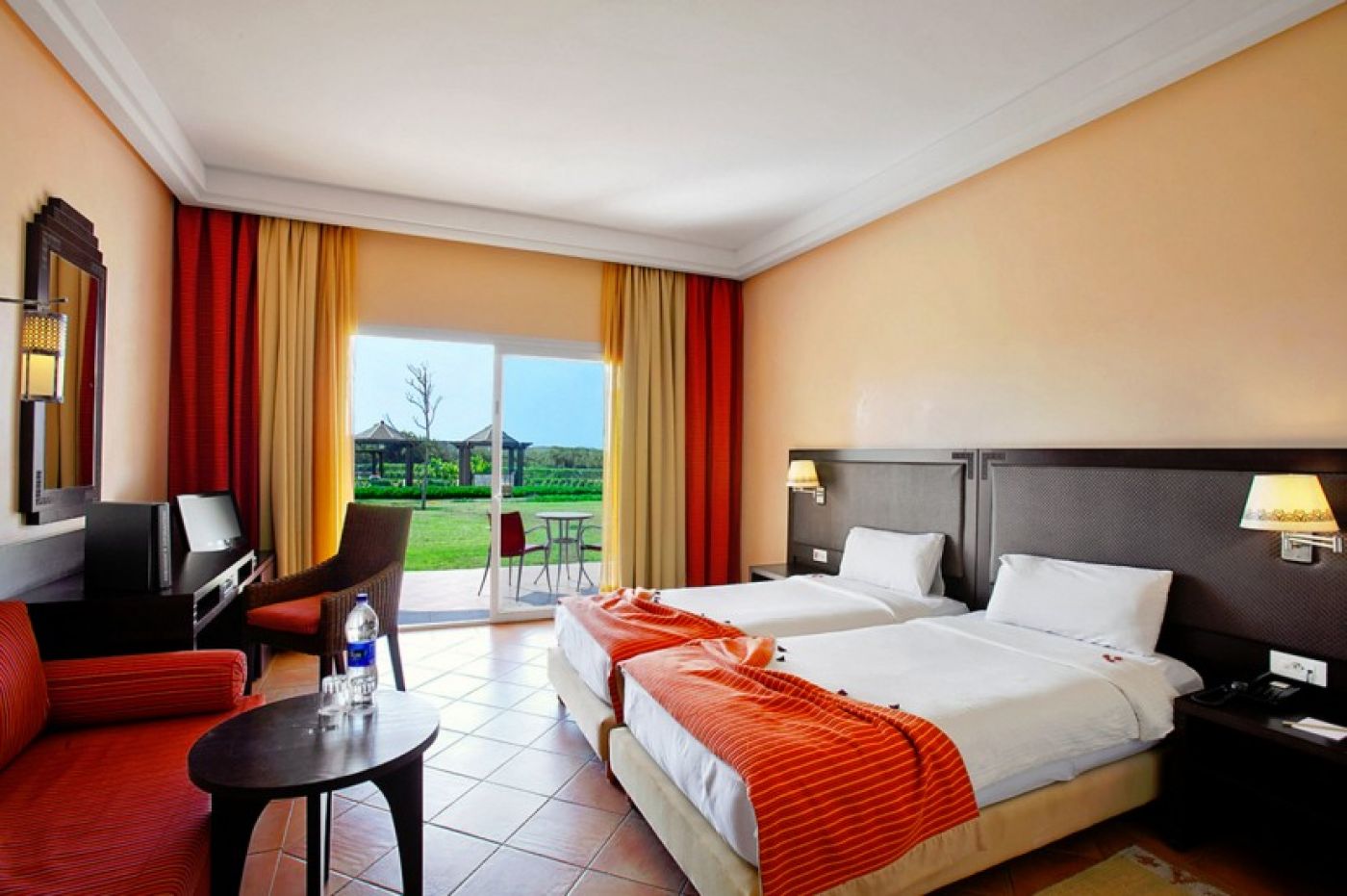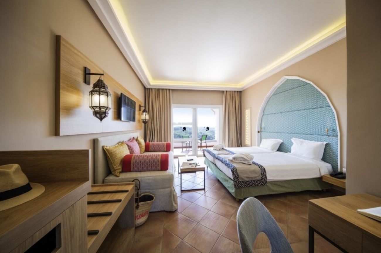 В стаите: Всички стаи са с балкон или тераса, с градински маса и столове и/или шезлонги, сателитна телевизия, сейф, сешоар, минибар. Двойни стаи-33 кв.м, две двойни легла или спалня, диван в лаундж зоната. Фамилни стаи- 66 кв.м., 2 отделни спални свързани помежду си, с две двойни легла, фамилна спалня и две бани. Senior Suite и Junior Suite- 105 кв.м., хол, 2 отделни спални, 2 бани с душ кабина и вана и гледка към морето.