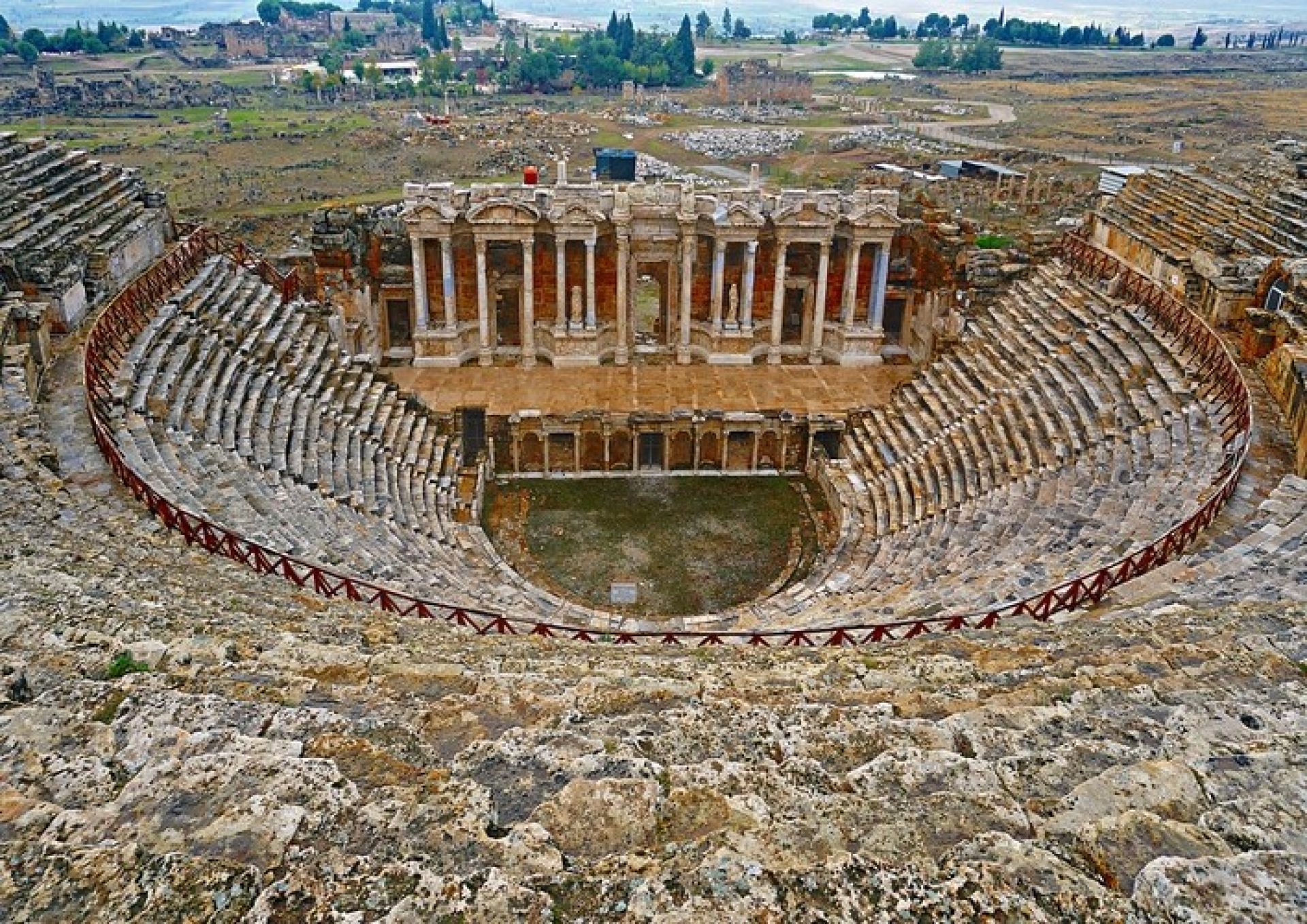 въглероден диоксид, отчасти на желязо и радиоактивни елементи. Близо над Памуккале се намират развалините на античния град Хиераполис (в превод - Свещен град), основан през 190 г. пр.н.е. от династията на Аталидите - владетелите на Пергамон. Градът бил популярен сред гърците и римляните, страдащите от кожни болести и ревматизъм. Едно от интересните съоръжения в Хиераполис е амфитеатъра. Първоначално той е построен на североизток от северната порта, но е бил разрушен от силно земетресение през 17 г. от н.е. След земетресението през 60 г. от н.е по време на царуването на император Тит Флавий е построен нов театър, издълбан в склона на хълма, на изток, като се използват и останките на ярусите на стария театър. Днес театърът е в процес на реставрация. Побира 10 000 зрители и е втория по големина след този в Ефес в Мала Азия. Следващото забележително съоръжение на града е прочутият му некропол, който се простира от северната до източната и южна част на стария град. Повечето от всичките 1 200 гробници са изградени от варовик. Нещо повече, некрополът е изпълнен със саркофази на високопоставени личности, включително Саркофагът на Марк Аврелий Амианос. По път посещение на Outlet Centre за текстилни изделия. Вечеря. Нощувка.