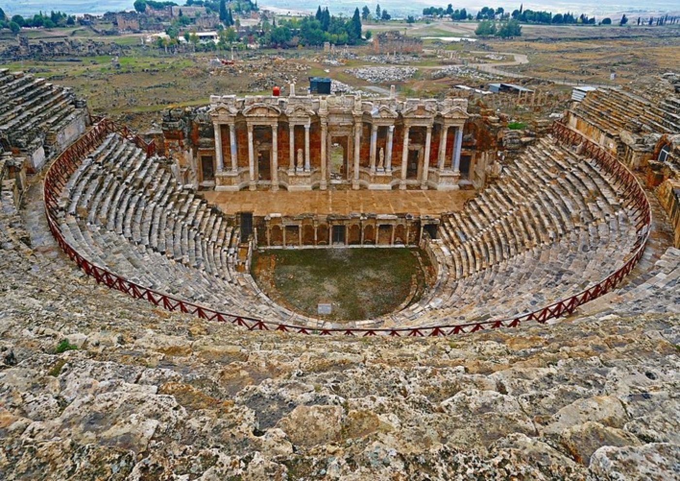 въглероден диоксид, отчасти на желязо и радиоактивни елементи. Близо над Памуккале се намират развалините на античния град Хиераполис (в превод - Свещен град), основан през 190 г. пр.н.е. от династията на Аталидите - владетелите на Пергамон. Градът бил популярен сред гърците и римляните, страдащите от кожни болести и ревматизъм. Едно от интересните съоръжения в Хиераполис е амфитеатъра. Първоначално той е построен на североизток от северната порта, но е бил разрушен от силно земетресение през 17 г. от н.е. След земетресението през 60 г. от н.е по време на царуването на император Тит Флавий е построен нов театър, издълбан в склона на хълма, на изток, като се използват и останките на ярусите на стария театър. Днес театърът е в процес на реставрация. Побира 10 000 зрители и е втория по големина след този в Ефес в Мала Азия. Следващото забележително съоръжение на града е прочутият му некропол, който се простира от северната до източната и южна част на стария град. Повечето от всичките 1 200 гробници са изградени от варовик. Нещо повече, некрополът е изпълнен със саркофази на високопоставени личности, включително Саркофагът на Марк Аврелий Амианос. По път посещение на Outlet Centre за текстилни изделия. Вечеря. Нощувка.
