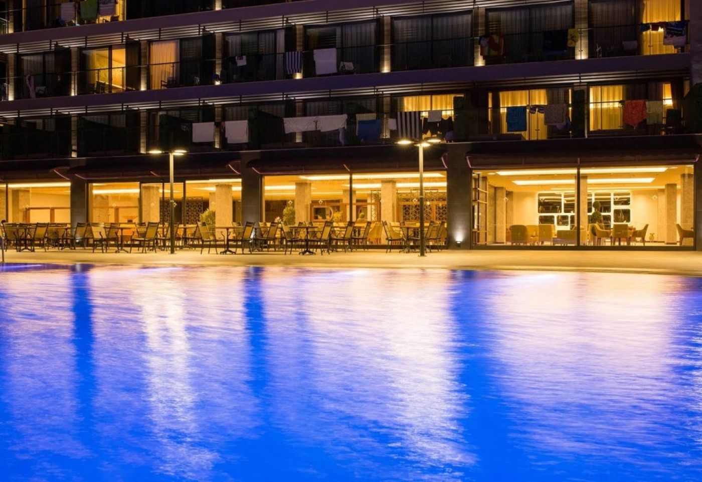 Основен ресторант, 4 бара, открит басейн, релакс басейн, 2 водни пързалки, турска баня, сауна, магазин, фризьор, фитнес център, тенис на маса, аеробика, дартс, амфитеатър, паркинг. За децата – 2 детски басейна, игрална зала за деца от 4 до 12 год., мини клуб, детска площадка. Безплатни услуги – Тенис на маса, фитнес, дартс. Платени услуги – Масаж, сейф, късен чек аут, пералня, мини бар, лекар, детегледачка, водни спортове, интернет, кафе. Плаж - собствен, пясъчен. Чадъри и шезлонги при басейна и на плажа - безплатни.
