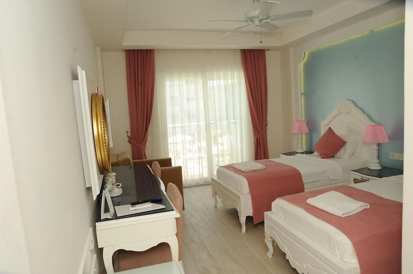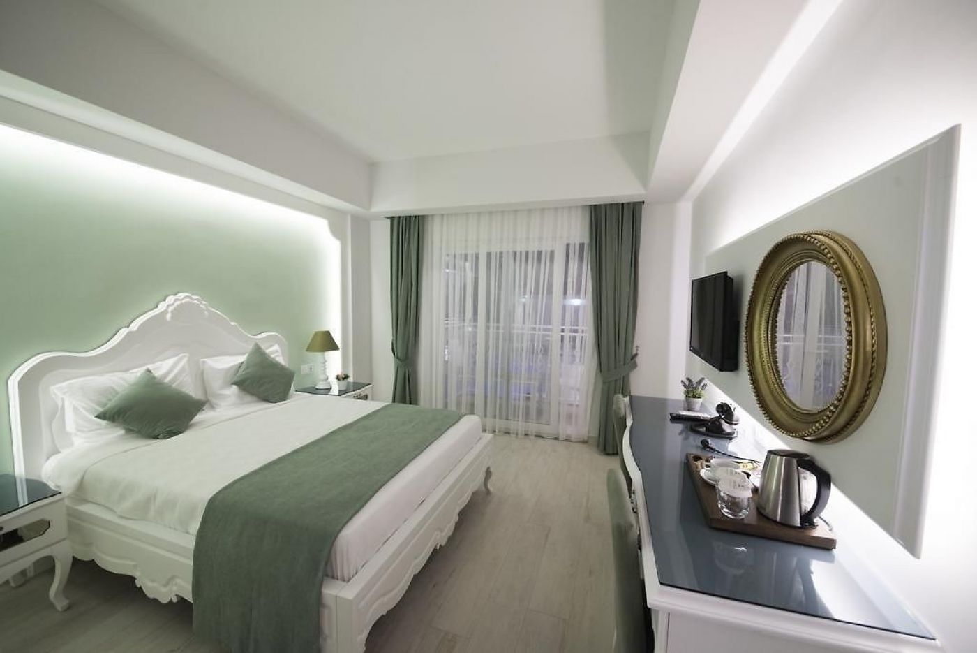 Стаи: Honeymoon Room (18 m2, специален дизайн за меден месец, подова настилка от керамични плочки, балкон, баня и душ кабина, климатик тип сплит, сешоар, електронен сейф, сателитна телевизия (LCD), директен телефон, минибар и електрическа кана.)