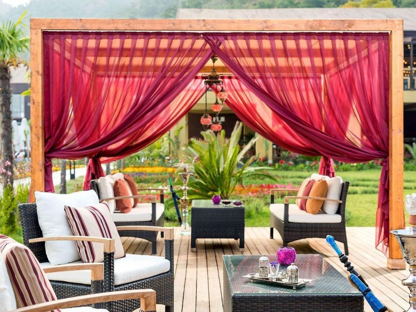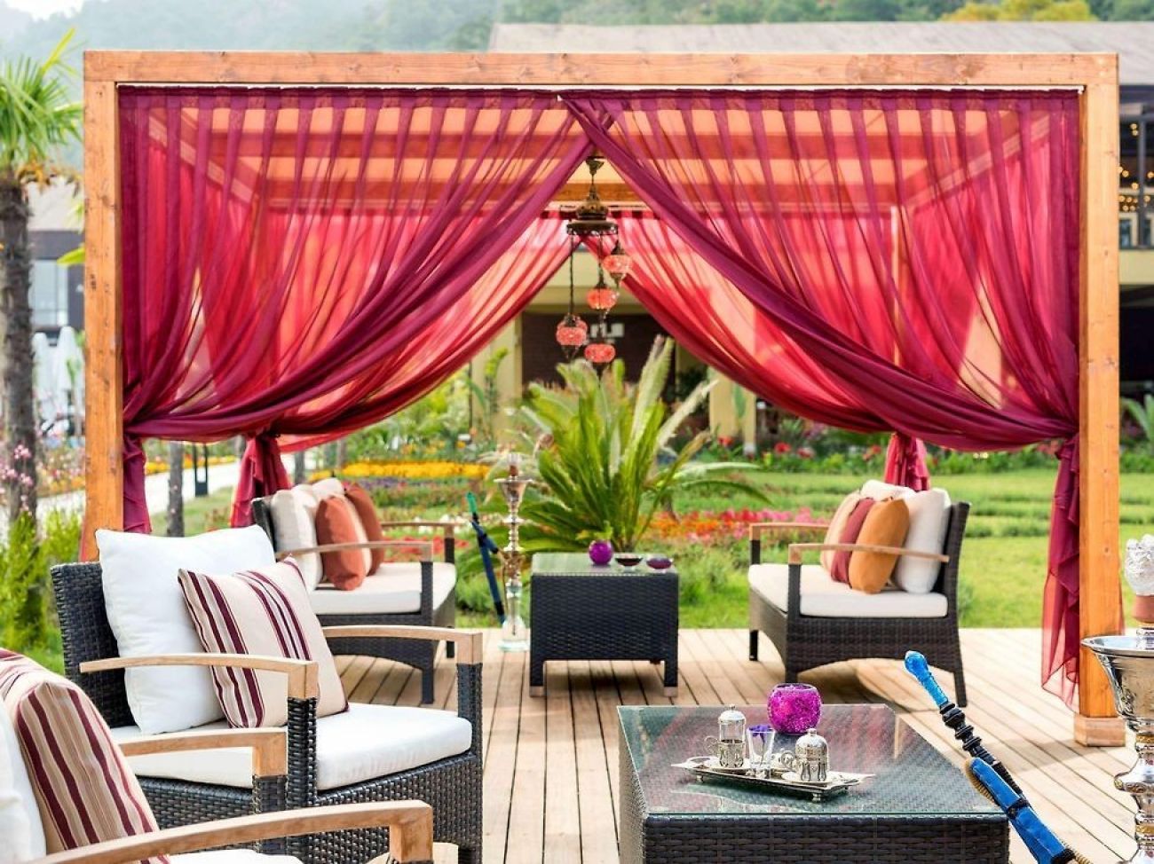 В стаите: Хотелът разполага общо с 192 апартамента и вили, разположени в 20 блока. Deluxe Suite garden view (45 m2), Junior Suite (една спалня и една всекидневна, 55 m2), Friends Suite (две спални, 55 m2). Всички стаи са са оборудвани с климатик, телевизор, телефон, баня с душ/вана, сешоар, сет за чай/кафе, мини бар (безплатен), сейф, балкон. Почистване на стаите, смяна на спалното бельо и кърпите – всеки ден.