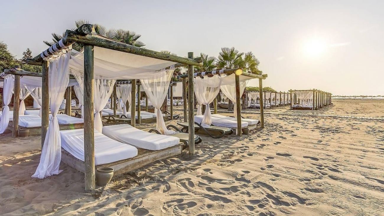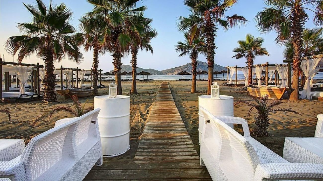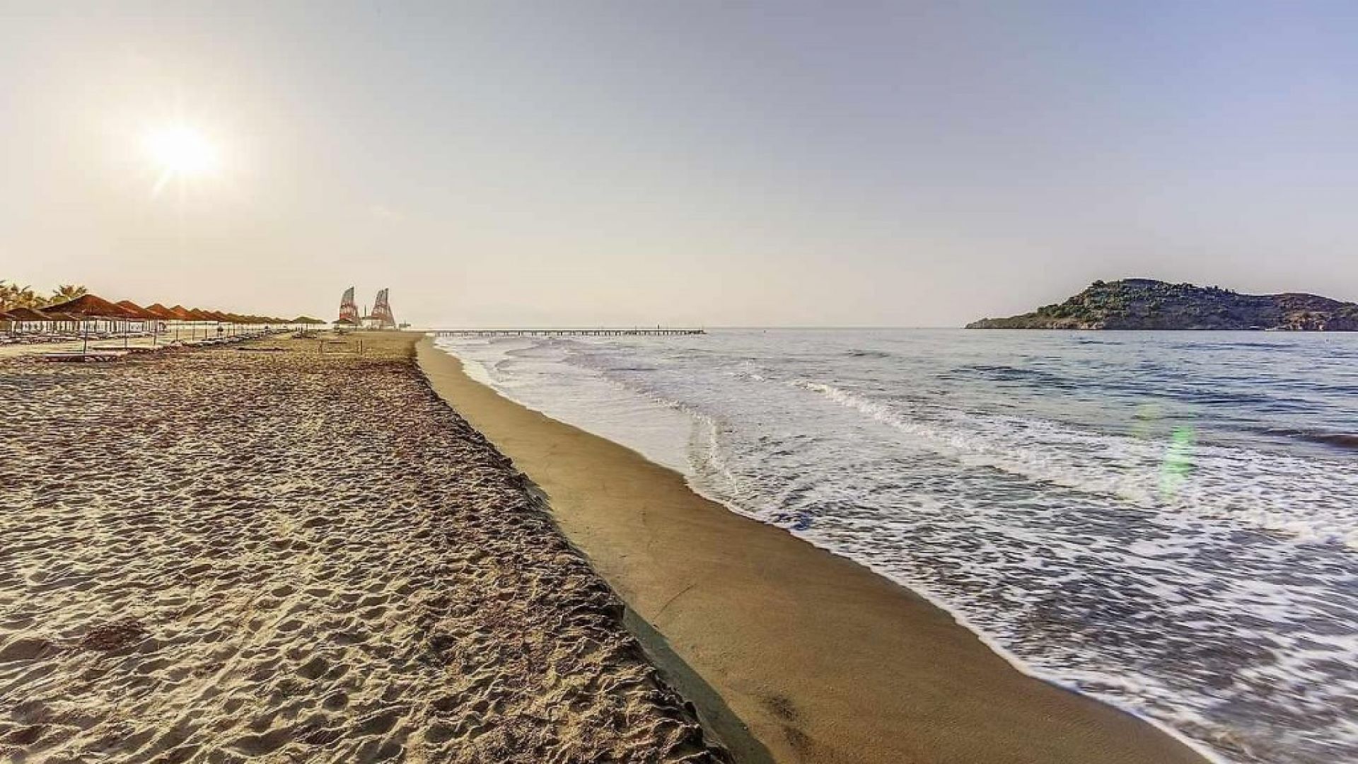 Плаж: Собствен пясъчен плаж на 50 м от хотела (1 брегова линия). Дължина 280 м. Има кей. Плажното оборудване и хавлиите са безплатни.