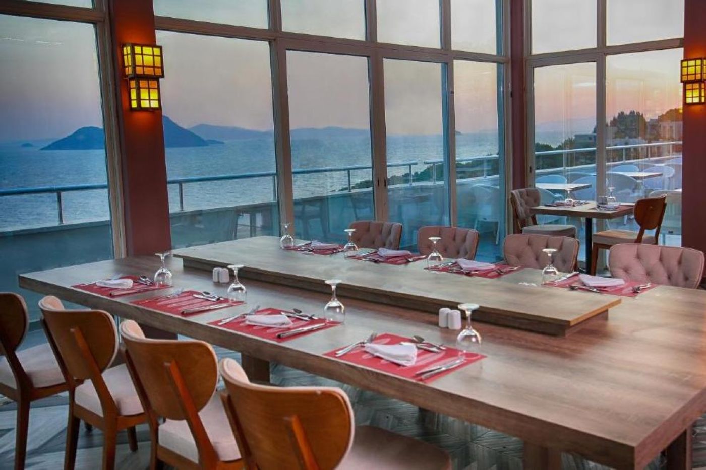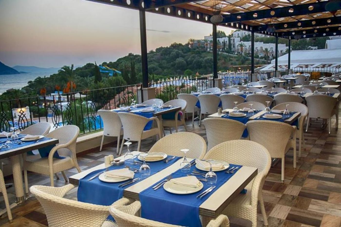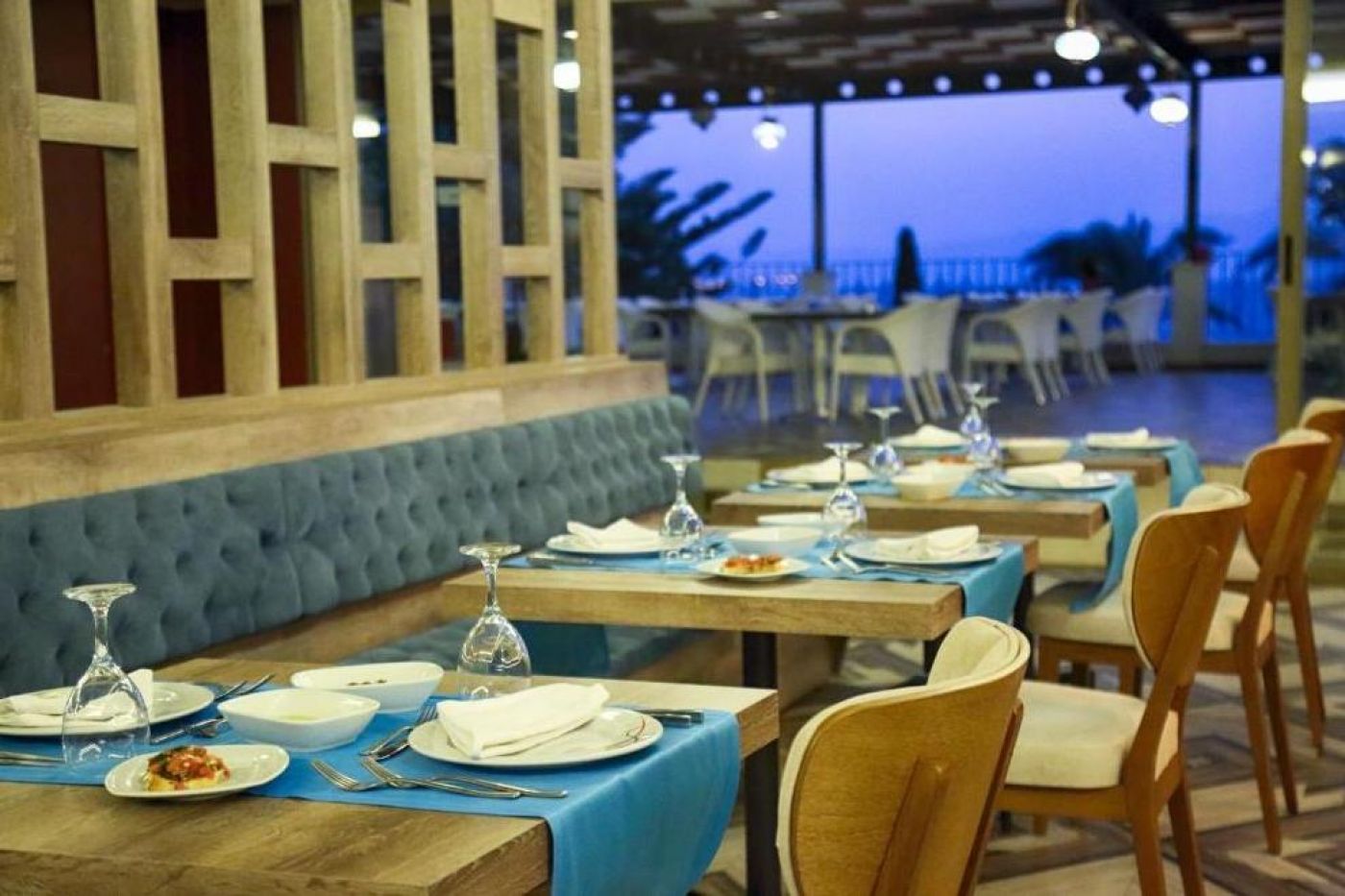Хотелът има основен ресторант Myndos и 3 а`ла карт ресторанта: рибен Oceania, турски Sultan, италиански La Perla (с предварителна резервация; едно безплатно ползване при минимален престой от 7 нощувки). Всички ресторанти са реновирани през 2024 г. Освежаващи напитки се предлагат в 5 бара (при басейна, на плажа, 2 снек бара и лоби бар, който работи 24 часа). Ultra all inclusive концепцията включва закуска, обяд и вечеря на шведска маса. Междинни хранения, алкохолни и безалкохолни напитки местно производство и някои вносни напитки (24-часов бар и ресторант) - без лимит (съгласно концепцията на хотела). Прясно изцедени сокове - срещу допълнително заплащане.
