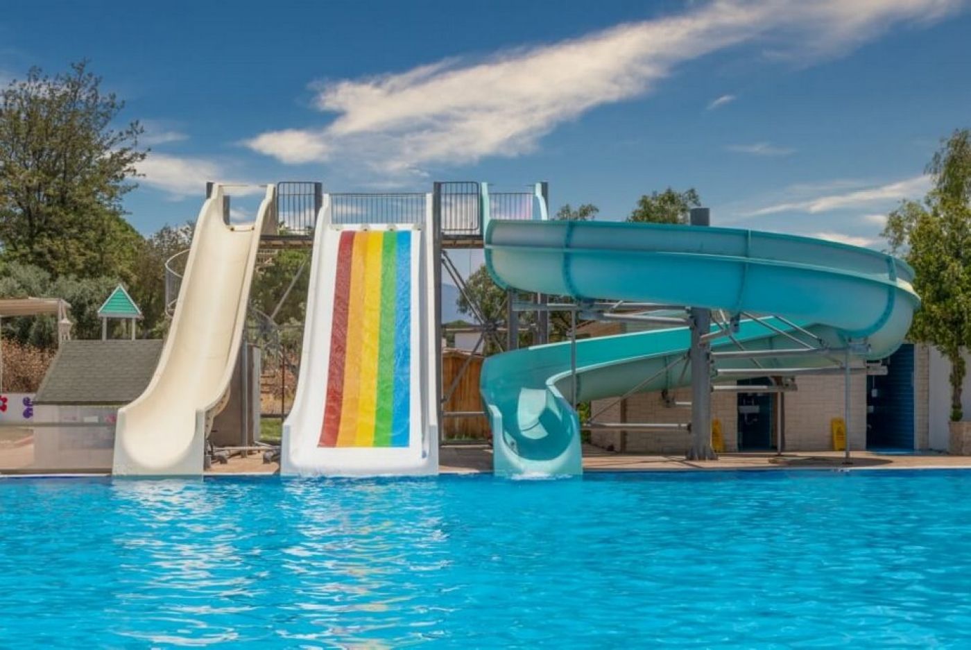 Собствен пясъчно-чакълест плаж. Открит басейн с три водни пързалки.
