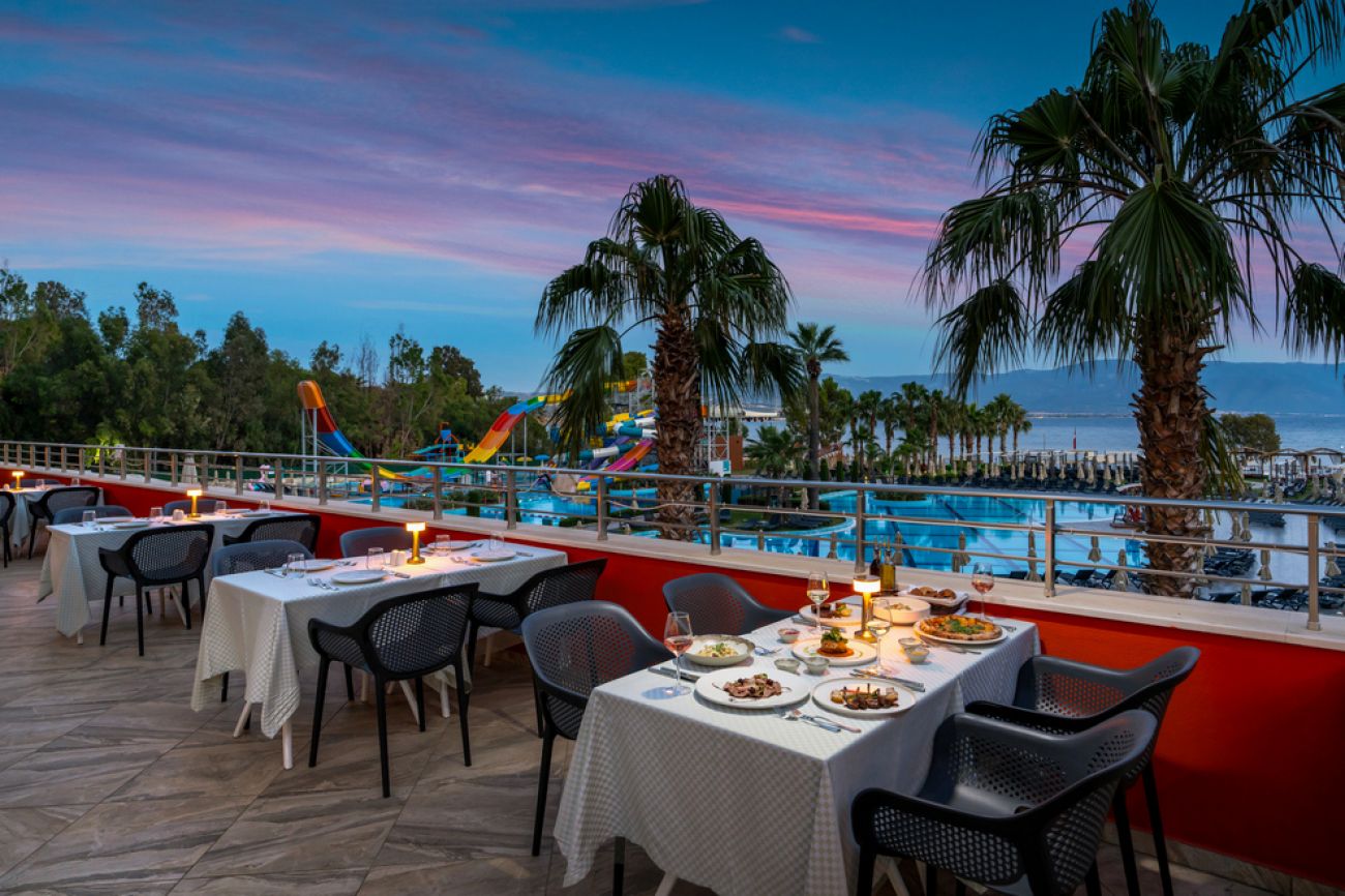 На разположение на гостите са основен ресторант за закуска, късна закуска, обяд, вечеря. Booze & Snack a la carte ресторант е отворен за обяд от 12:00 - 17:00 ч. Сладкарницата работи денонощно. 5 а`ла карт ресторанта: Seven, Mi Restaurant, Lime Mexican (безплатнo, с предварителна резервация чрез приложението Liberty), Dolce Vita Italian и Yamas (срещу заплащане, с предварителна резервация чрез приложението Liberty). Разнообразни напитки и закуски се предлагат в 6 бара: Timeless Bar (работи денонощно), Palm Court Bar, Tokyo Bar, Milkshake & Smoothie Bar, Penthouse Adult Bar (16+), Booze & Snack Pool Bar 10:00-18:00 ч.