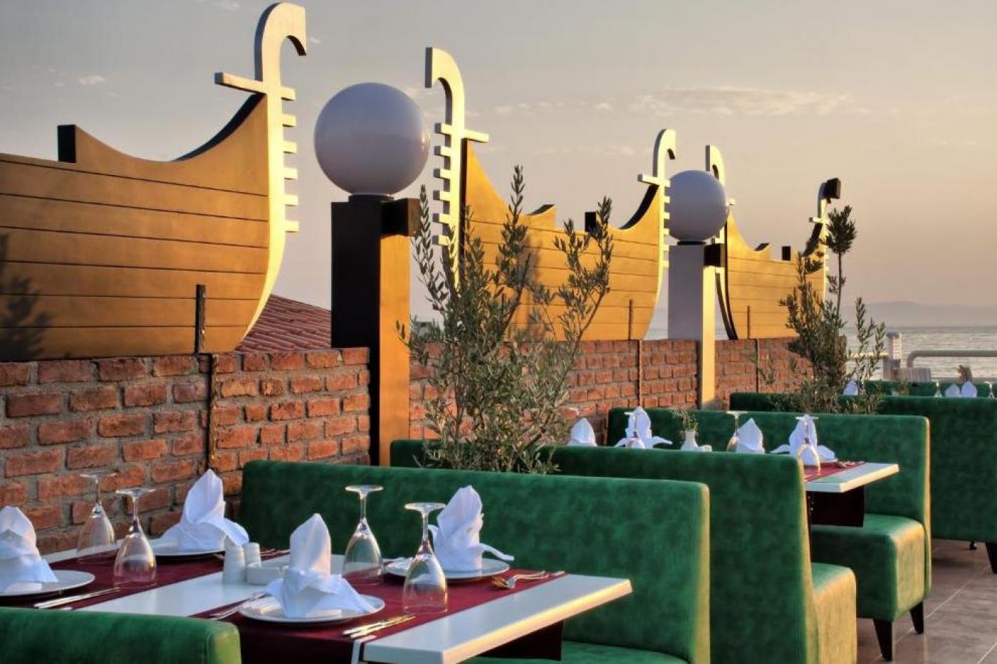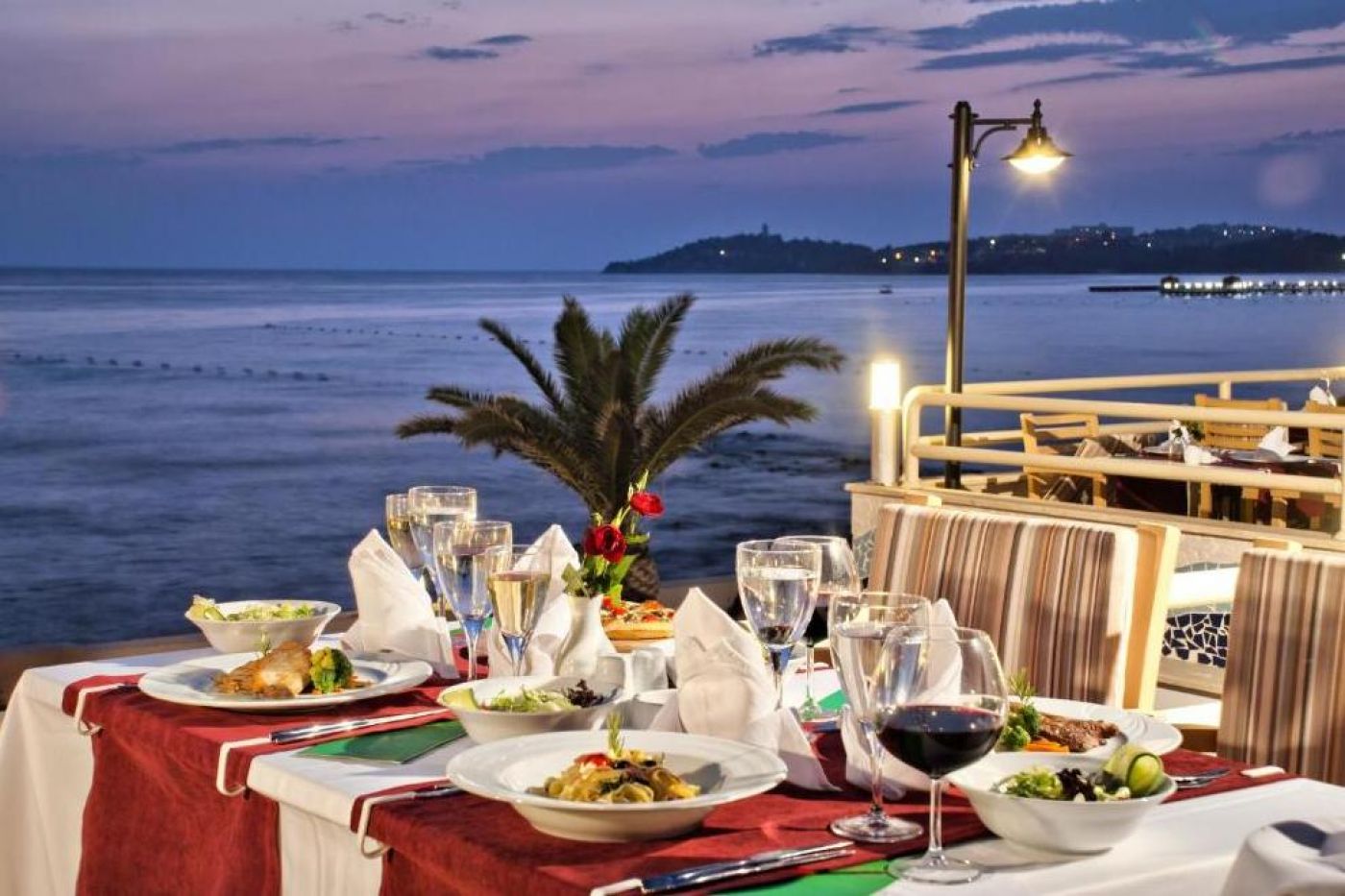На разположение на гостите са основен ресторант (680 места) и 3 а`ла карт ресторанта, 2 рибни ресторанта Nautilius (60 места) и 1 италиански ресторант La Veranda (60 места). На територията на хотела има и бар в ресторанта, снекс бар, бар при басейна, лоби бар, и бар на плажа. ALL INCLUSIVE концепцията включва закуска, обяд и вечеря на шведска маса; допълнителни хранения и напитки местно производство.
