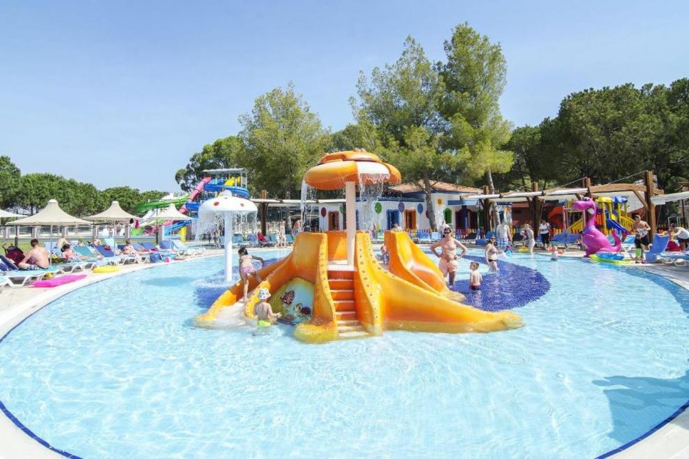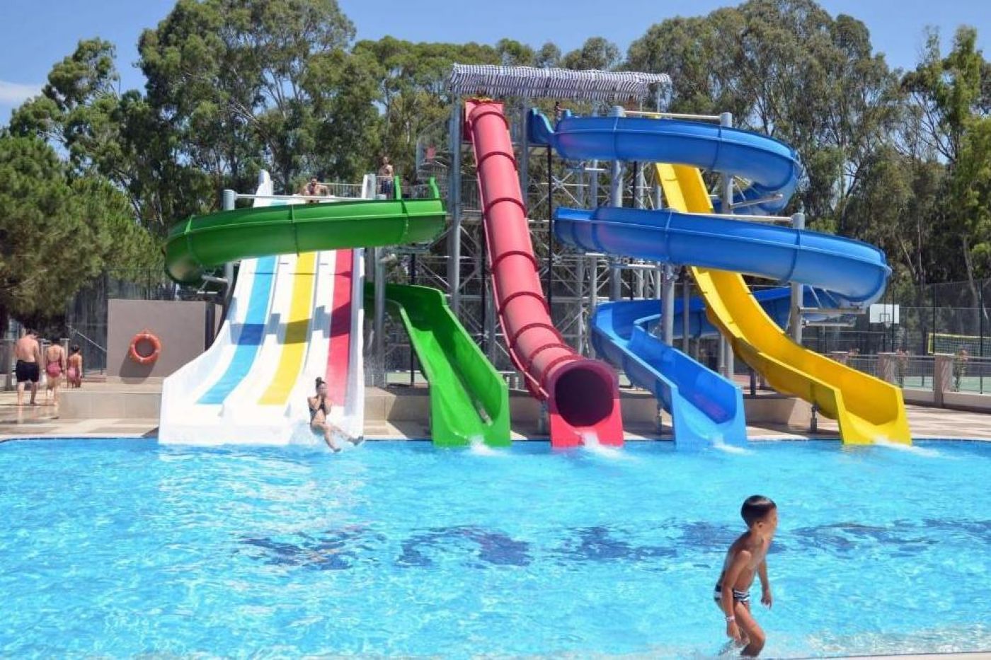 Собствен пясъчен плаж, притежател на сертификат "Син флаг". Предлага 2 открити басейна с прясна вода (неотопляеми), с площ 1080 кв.м. и 271 кв.м. Работно време: 08:00-18:00 ч. 5 водни пързалки (неотопляеми), работно време 10:00-12:00 ч./14:00-16:30 ч. Чадъри, шезлонги и матраци при басейните и на плажа се предоставят безплатно.
