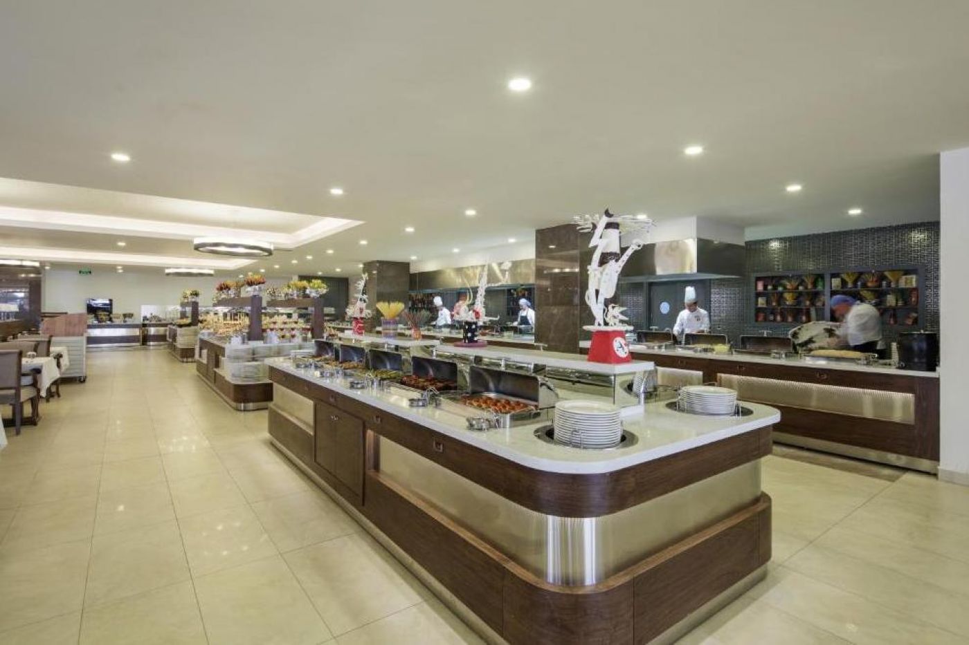 На разположение на гостите са основен ресторант за закуска, късна закуска, обяд, вечеря, късна вечеря. Между 12:30 и 16:00 ч. закуски се предлагат в снек бара. 3 а`ла карт ресторанта: италиански, турски и рибен. Разнообразни напитки се предлагат в 5 бара: бар на плажа, лоби бар (работи денонощно), London Bar, Relax Bar и диско бар.
