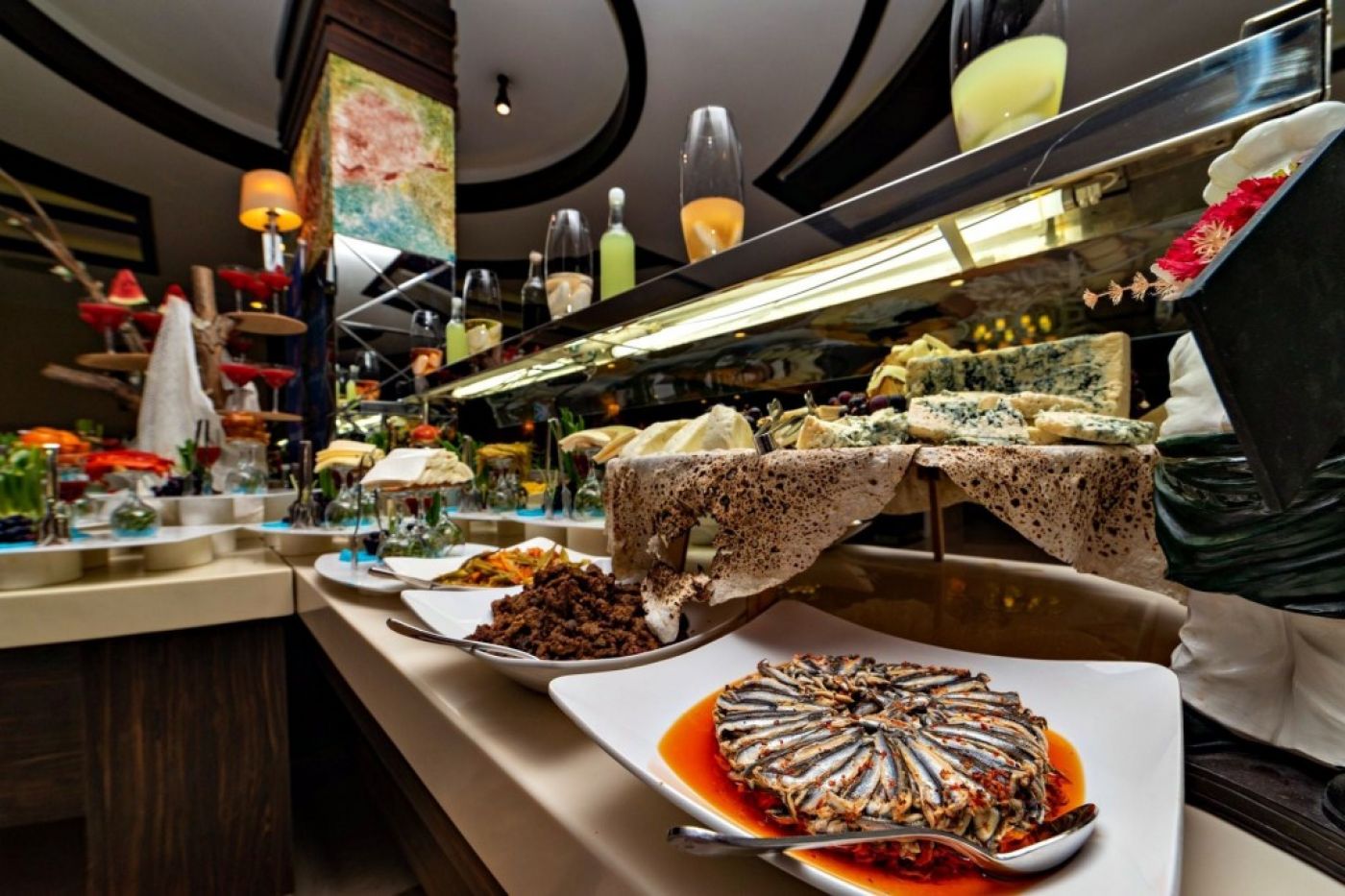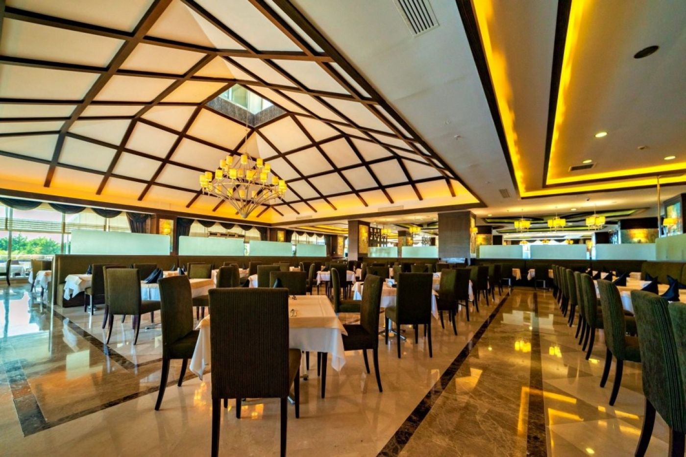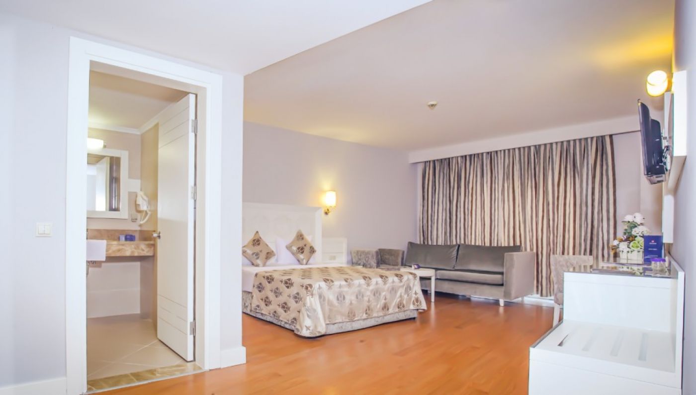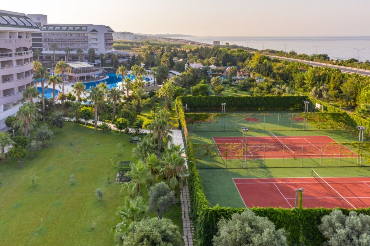 На територията на хотела: основен бюфет ресторант ( открита и закрита част), 3 а-ла-карт ресторанта : италиански, турски, азиатска кухня, снек бар, 5 бара, витамин бар с прясно изцедени плодови сокове, открит басейн, 4 водни пързалки, СПА център, фитнес център, тенис на маса, тенис на корт, анимация, тематични вечери, жива музика, WIFI в общите части и стаите, конферетни зали. Клиентите на хотела имат право на едно посещение на всеки от трите а-ла-карт ресторантите при престой от минимум 7 нощувки. Необходима е предварителна резервация за тях.