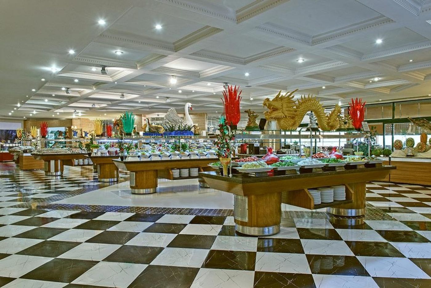 Ресторанти и барове: основен ресторант (07:00–03:00), ресторанти а ла карт с мексиканска, китайска, турска, италианска, средиземноморска и японска кухня (19:00–21:30), рибен ресторант (19:00–21:30), кафене "Ориент" (09:00–23:00), лоби бар (09:00–02:00), снек бар "Фантазия" (10:00–18:00), бар край басейна (10:00–18:00), пъб "Делфин" (15:00–07:00), бар "Арена" (20:00–23:00), витаминен бар (09:30–18:00), бар на плажа (10:00–18:00), бар "Харем" (20:30–00:00), бар "Млечен шейк" (11:00–12:00 и 14:00–15:00), Gatden Secret Bar (11:00–01:00), Pier Bar (20:30–00:00), Temple Bar (18:00–00:00), Relax Bar (10:00–18:00) и Atlantis Disco Bar (22:30–02:00).