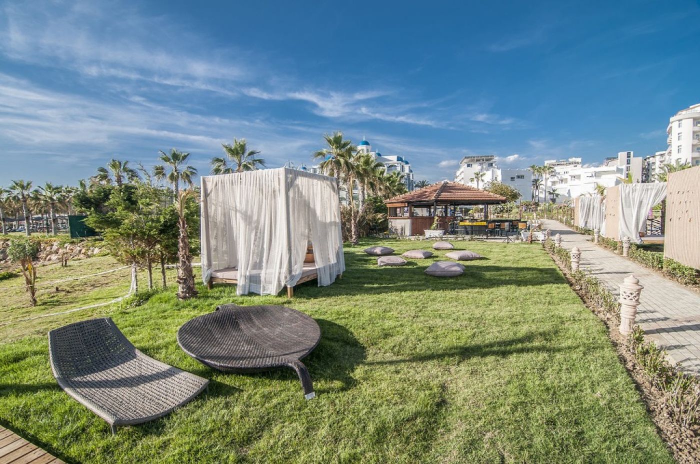 Разположение: Хотелът се намира само на 150 м от частично скалистия, пясъчно -чакълест плаж. Разстоянието до центъра на Алания е 22 км, където се намират и множество търговски и развлекателни съоръжения, магазини, бутици, пазари, барове. Разстоянието е достъпно от хотела с частно такси или обществен транспорт. Международното летище на Анталия е приблизително на 100 км