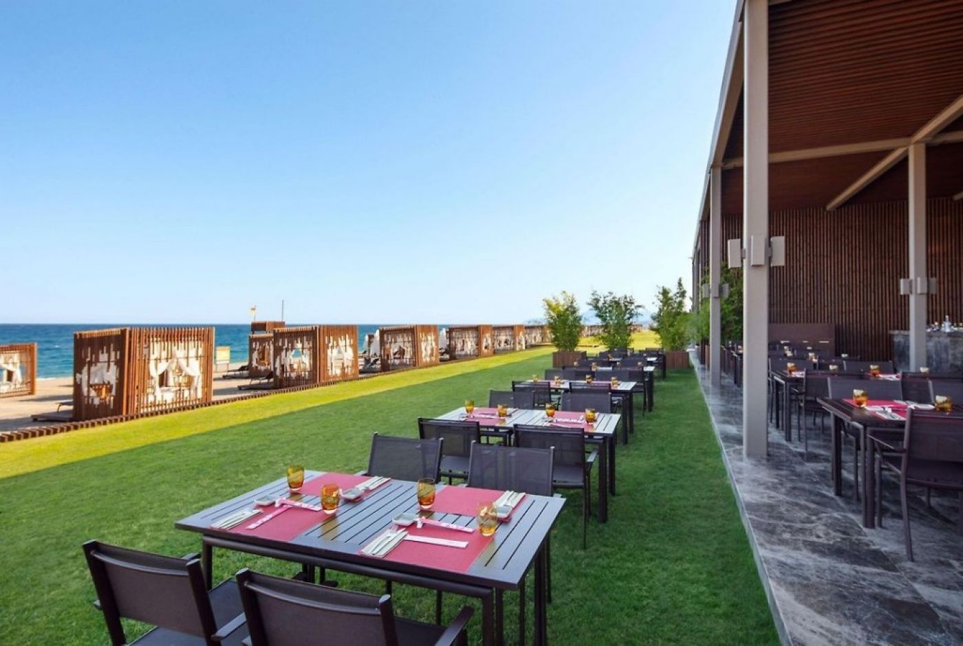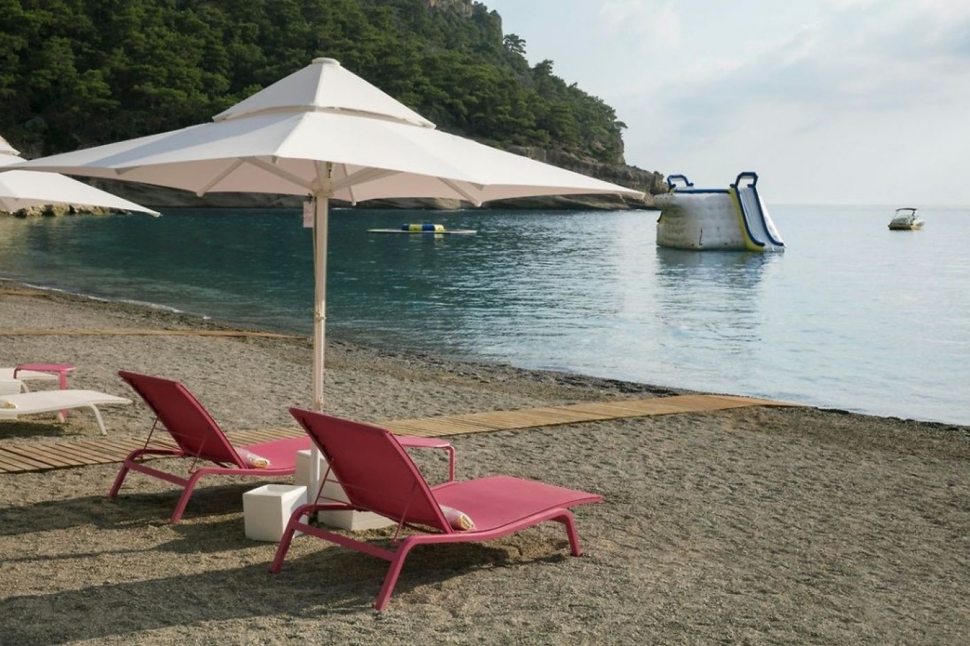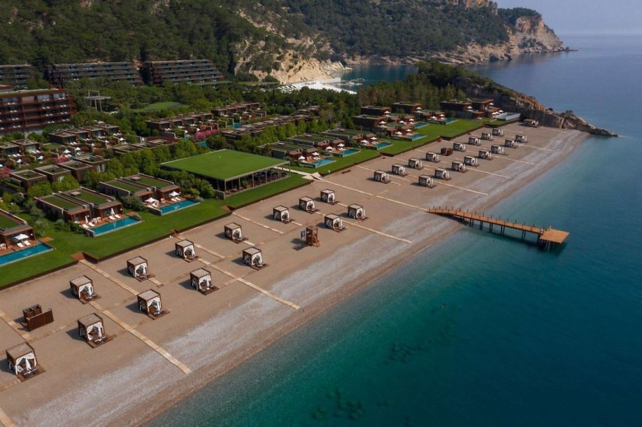 Плаж: На територията на хотела (100 м от основната сграда) се намира частен плаж с малки камъчета. Два частни 200-метрови залива, 400-метров частен плаж, 30-метров плаж за деца. Шезлонги, чадъри, матраци, плажни кърпи са безплатни. Входът към морето е малко камъче. Кабини за преобличане, душ, спасител на плажа, бар. Частните павилиони са платени. Обслужване на хладни кърпи и бърсане на слънчеви очила на плажа (безплатно).