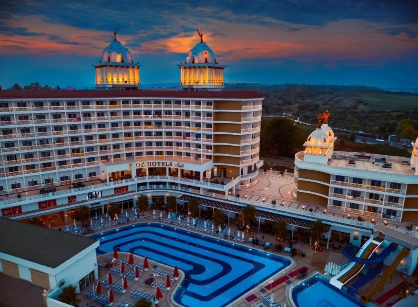 Oz Hotels Басейни в Sui Resort; Основният басейн е с дълбочина 140 см и площ 726 m². Басейнът на Aquapark е с дълбочина 120 см и площ 105 m². Детският басейн е с дълбочина 35 см и площ 40 m². Закритият басейн е с дълбочина 140 см и площ от 156 m². Аквапаркът е отворен между 10:30-12:00 ч. и 14:30-16:30 ч. Шезлонги, кърпи и чадъри се предоставят безплатно на всички наши басейни. Часовете за обслужване на басейните могат да варират в зависимост от метеорологичните условия и сезона.