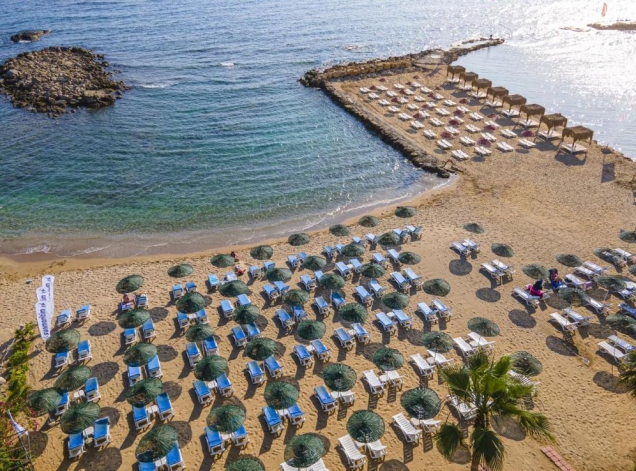 Плажът на хотела е с фин пясък; Плажът е пясъчен, морето е с фин пясък и отчасти каменисто. Матраци, шезлонги и чадъри - безплатно. Другите услуги на плажния бюфет са с допълнително заплащане.