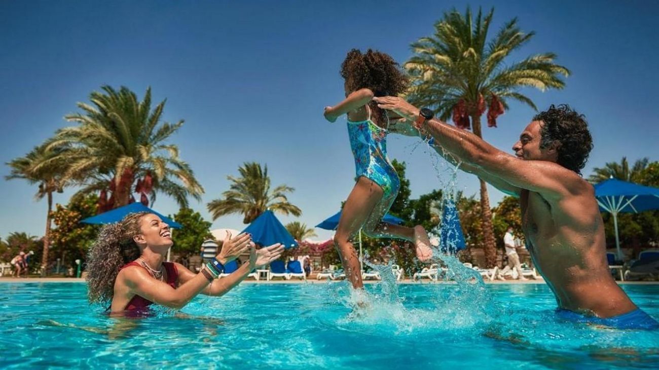 Desert Rose 5* разполага със собствен девствен пясъчен плаж с дължина от 1км, с 40 000 м² природна лагуна със златист пясък. Хотелът предлага на своите клиенти идеална атмосфера за забавления или просто да се насладят на прекрасния ненадминат климат на Червено море. Хотелът разполага с 4 плувни басейна, 1 с олимпийски размери, голям плувен басейн с палуби за слънчеви бани и бар край него, отопляем семеен плувен басейн и детски плувен басейн, специализиран за бебета и малки деца със собствен мини душ и мини столове. Като допълнение Аквапаркът предлага още и 6 водни пързалки.