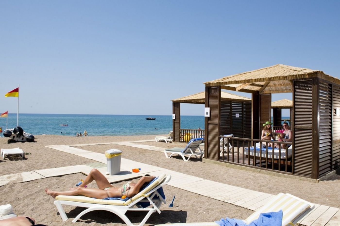 Плаж: 2-ра линия - 450 метра от хотела, частен пясъчен плаж с камъчета. Чадъри, шезлонги, матраци, кърпи - безплатно. Между хотела и плажа има алея. За плажа има шатъл на всеки половин час. Дължината на плажа е 80 m. Павилиони на плажа (срещу допълнително заплащане). Душ на плажа. Детска площадка (на сянка).